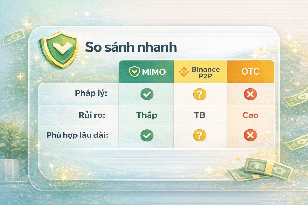 Tuy nhiên, việc cash out USDT không phải lúc nào cũng đơn giản. Các phương thức như P2P, OTC tự phát hay giao dịch trung gian đều tiềm ẩn những rủi ro nhất định, đặc biệt liên quan đến minh bạch, scam và yếu tố pháp lý. Trong bối cảnh đó, MIMO được nhiều người nhắc đến như một giải pháp đổi USDT sang VND an toàn và dễ kiểm soát hơn.